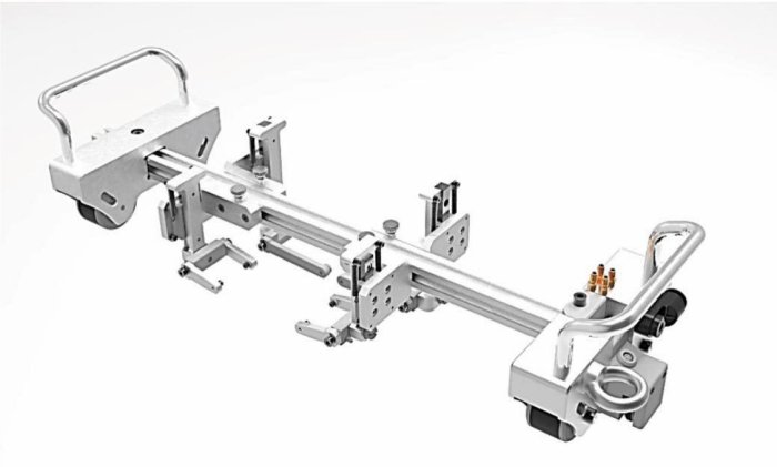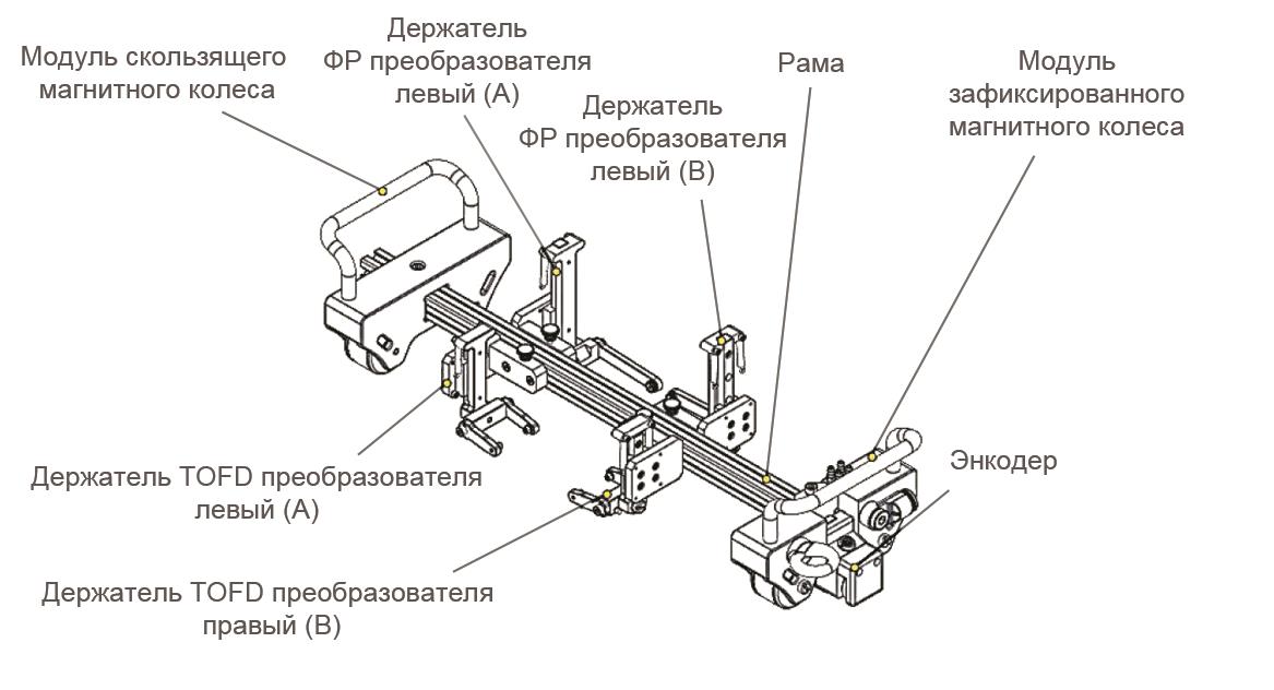 Он состоит из следующих частей: модуль скользящего магнитного колеса, держатель ФР преобразователя 2 шт., держатель TOFD преобразователя 2 шт., рама, модуль фиксированного магнитного колеса, энкодер (датчик пути).