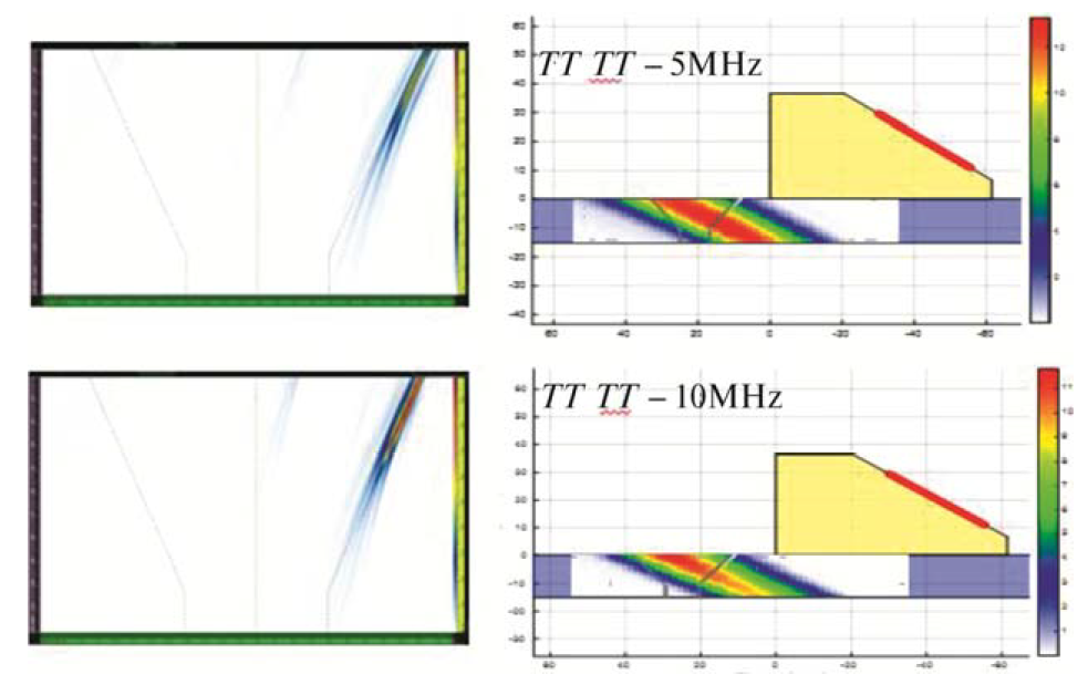 За счет использования наклонного луча при контроле сварных соединений и последующей трансформации волны настройка конфигурации оборудования может быть сложна. Как показано ранее на примере контроля прямым лучом, акустическая область влияния может быть весьма полезным инструментом для выбора оптимальных параметров и настройки контроля. При выявлении вертикальных дефектов AROI показывает, что некоторые направления распространения УЗ-волны (такие, как TLT) более подходят для приповерхностных дефектов, тогда как другие (такие, как TTT) могут использоваться для выявления дефектов у дальней стенки.