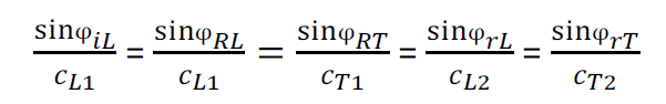 Рис. 4. Закон Снеллиуса: φiL – угол падения продольной волны; φRL – угол отражения продольной волны; φRT – угол отражения поперечной волны; φrL – угол преломления продольной волны; φrT – угол преломления поперечной волны; cL1 – скорость продольной волны в материале 1; cT1 – скорость поперечной волны в материале 1; cL2 – скорость продольной волны в материале 2; cT1 – скорость поперечной волны в материале 2