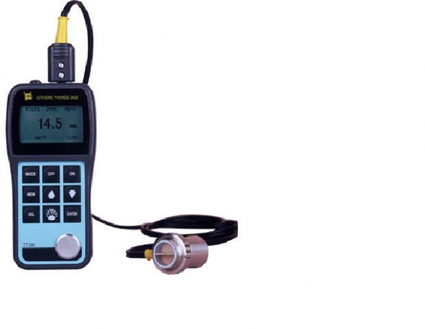 Прибор TT 340 применяется для измерения толщины различных изделий из металлов и неметаллов, а также отливок с возможностью отображения текущего и минимального значения толщины (выбираемого в программном меню), встроенной памятью на 500 измерений, отображением результатов в миллиметрах или дюймах, индикацией степени разрядки источника питания, регулируемой яркостью подсветки ЖК-дисплея.